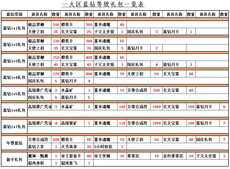 一大区年费蓝钻每月可领取年费礼包一次,蓝钻等级礼包一次,每个人新手礼包只能领取